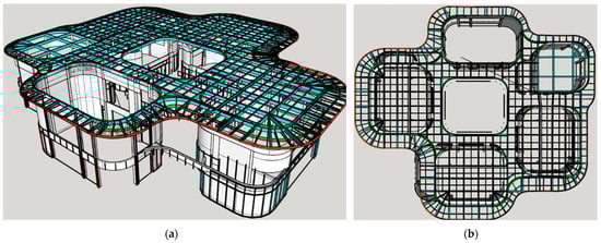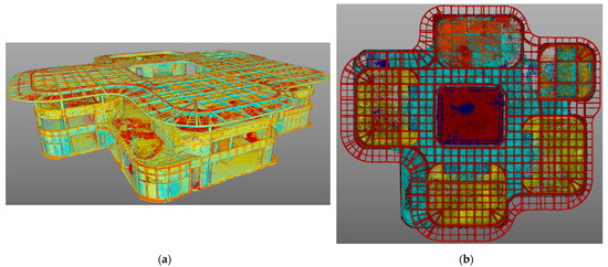 The reconstructed 3D BIM model from the processed point cloud: (a) side view; (b) vertical view.