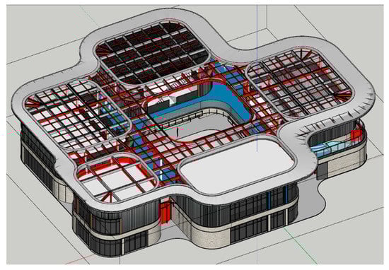 The processed point cloud was consequently imported into BIM modeling software for setting up each scanned component of the target building. Based on the reconstruction and assembling of component models, a complete 3D BIM model representing the as-built condition of the completed structural surface was established in the Sketchup software by aligning the transformed objects as shown in Figure 11.