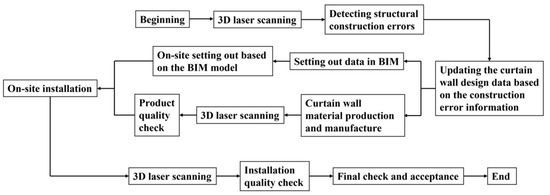 - The field case showed the potential and demonstrated the effectiveness of the application of 3D laser scanning, and is encouraging the value of the integration of 3D laser scanning and the BIM approach in the curtain wall construction field. A comprehensive workflow summarized based on this case is given in Figure 14. It should be noted that the quality control after the curtain wall system has been installed which is not mainly concerned in this paper is as well presented in this workflow in order to provide a complete concept.