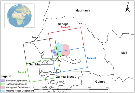Map of the study area in the Kaffrine region with its four departments.