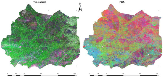 PCA was performed to reveal the spatial distribution of the land cover classes and to visualize the temporal changes in the multivariate space. Compared to a temporal color composite, the color composite of PCA showed a better discrimination of the different land use classes (Figure 5). Indeed, the spatial pattern of the LULC classes was retrieved better by using the PCA color composite, while the temporal color composite represented less information from the tree dates compared to the first three PCs, containing most of the time-series information. A visual interpretation of the LULC classes revealed differences in the spatial distribution of some classes, but the pattern of the cropland class was visible on both composites, with more detail in the PCA composite. This demonstrates the potential of using GRD S-1 VH time-series data to detect the temporal behaviors of LULC classes, especially for cropland. This also demonstrates the potential of PCs to be efficient and small input features for the supervised machine-learning classifiers of SAR data for agricultural land use mapping. This performance may be explained by the fact that the PCA reduced data dimensionality by aggregating features into a smaller set of non-redundant components. In addition, the large number of input features can lead to multicollinearity and information redundancy, potentially affecting the separability of LULC classes [29].