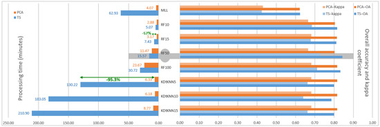 Figure 7 shows the performance metrics of the different classifications and their processing times using a powerful machine. Of all the classifiers with different input parameters, RF using 50 trees slightly outperformed based on the overall accuracy (OA), kappa coefficient, and processing time (PT). It reached an OA of 84.28% (kappa = 0.73) using the S-1 time-series data as the input with 15.57 min in PT. Only MLL performed poorly for both the PCA and TS inputs, with a kappa of 0.43 and 0.42 and an OA not exceeding 0.63 and 0.62 using PCA and TS, respectively. The use of PCs achieved good results, as with those obtained using TS data with less processing time. This was especially true for the KDtKNN classifier, which took a lot of processing time by increasing the nearest neighbor parameter k. PCA gave better results than TS and resulted in a further decrease in the processing time from 130 min to 6 min (−95.3%) for KDtKNN using k = 5 (Figure 7), while this gain in processing time rose up to 57% for RF. Although KNN produced a good accuracy, the classifier remained slower and costlier in terms of time and memory. In fact, it required a high-performance machine with a large memory to store the training dataset [28]. In addition, the Euclidean distance used in the KNN algorithm was very sensitive to magnitudes, as features in the dataset that have high magnitudes will always have more weight than those with low magnitudes. This paper shows that the PCA of an S-1 time series can be used to address the limitation of KDtKNN not being suitable for high-dimensional datasets, leading to problems with machine time and performance.