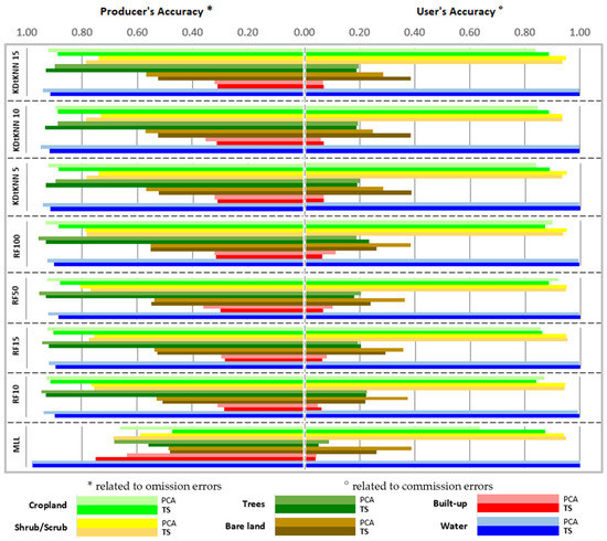 Class-specific assessment showing the user and producer accuracies of all classifications using TS and PCA input features. RF: random forest using different numbers of trees—10, 15, 50, or 100; KDtKNN: K-D tree KNN using different numbers of nearest neighbors—5, 10, or 15; and MLL: maximum likelihood. Each class shows two input datasets using two tones: bright (upper) and dark (lower) for PCA and time-series (TS) inputs, respectively.