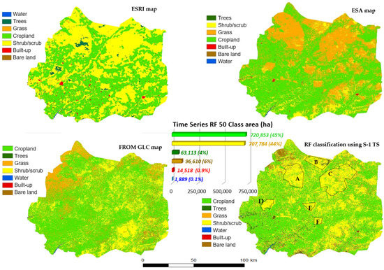The results of the land cover mapping showed a good delineation of the crop area located mainly in the middle and the southwest of the Kaffrine region. Bare soil and shrubs (no agricultural area) were located mainly in the north. Figure 8 shows the best result obtained using RF50 compared with the existing maps from the ESA world cover, ESRI land cover, and FROM-GLC10 2017. As shown in Figure 9, the areas of the classes obtained by our RF50 classifier were 720,853 ha for the cropland class (45%), 707,784 ha for the shrub/scrub class (44%), 96,610 ha for the bare land class (6%), 63,113 ha for the tree class (4%), 14,518 ha for the built-up class (0.9%), and 1889 ha for the water class (0.1%). The obtained map explained the dominance of cropland, especially in the south and center of the Kaffrine region. These results show the importance of the Kaffrine region in agricultural production. In descending order of area and production, the crops in the Kaffrine region are mainly groundnuts, millet, sorghum, and corn. Each year, groundnuts represent almost half of the total cultivated area in the Kaffrine region. Indeed, the groundnut production area in the Kaffrine region is one of the leading agricultural regions in Senegal. Groundnut production was widely promulgated there by the government, and in 2019, this production represented up to 19% of the global groundnut production in Senegal. In the Kaffrine region, groundnuts are often rotated with millet, and the season is popularly considered to start in June and end in November.