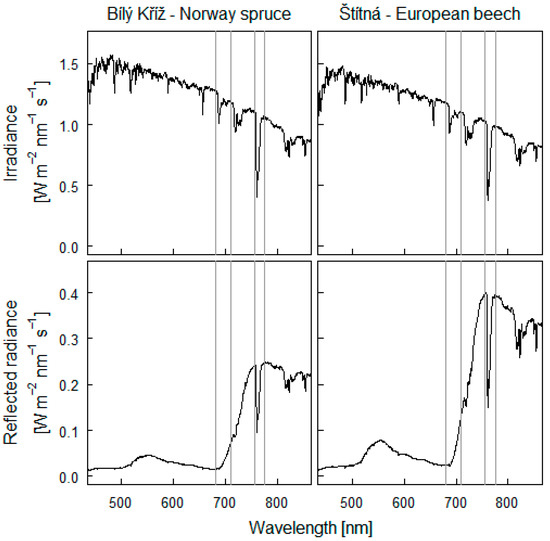 Spectra of irradiance and reflected radiance from the spruce (Picea abies) forest at the Bílý Kříž station and from the beech (Fagus sylvatica) forest at the Štítná station measured at midday on a sunny day in summer. Grey vertical lines indicate the wavelengths used as reference for estimating fluorescence emissions in the O2A band and in the O2B band from the spectra.