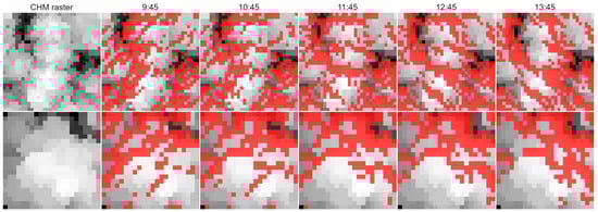 Canopy height model (CHM) raster images of trees measured using a spectrometer. On the left side, we show the structure of tree crowns as seen from above. Raster images are on a greyscale that indicates identified height of the pixel in the canopy. The upper row includes raw and αS images of spruce trees, lower row shows dynamics of beech tree. Dynamics of estimated shadow fraction in this area in 1 h steps near midday are shown with red color. Pictures show dynamics of shadows on 15 September.