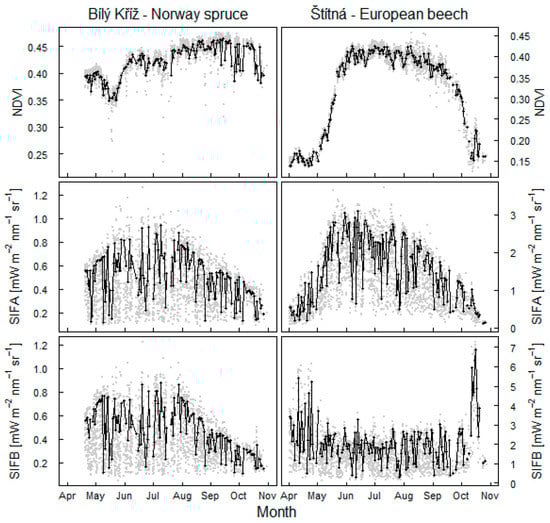 Dynamics of fluorescence in O2A band (SIFA) and fluorescence in O2B band (SIFB) shown in direct comparison with seasonal trend in NDVI at spruce and beech forests. Black dots show mean dynamics in a 2 h long period at midday. Grey points refer to dynamics at 30 min intervals within days with PAR intensities > 300 µmol m−2 s−1 and SZA > 25°.