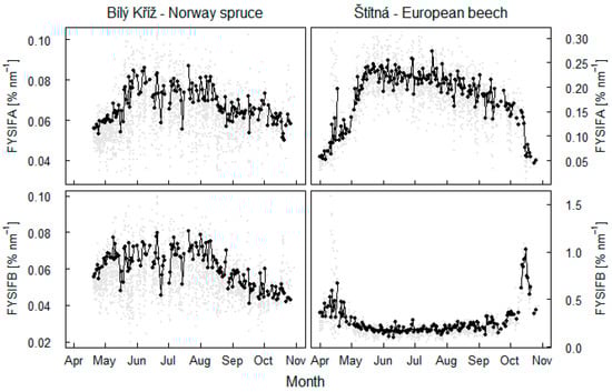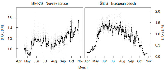At both sites, we detected a rapid increase in the SIFA:SIFB ratio in spring as NDVI increased with foliar development, then the ratio between SIFA and SIFB emission decreased towards August with adjustments in pigments. The trends diverged later towards the autumn. The ratio between SIFA and SIFB in spruce increased as a result of decrease in SIFB emission with reabsorption of this signal. In beech, the decrease with autumn senescence was observed and continued until falling to zero with leaf fall. The observed trend looked to be well-scaled across season with NDVI, and a decrease in the SIFA:SIFB ratio would be a common response to lowering chlorophyll content in trees following senescence and decreasing nitrogen status [59,60]. The opposite trend in the ratio between emissions was recorded by Corp et al. [61] in a corn field, with increasing fertilization. The observed trend would fit the dynamics of our data in spruce forest.