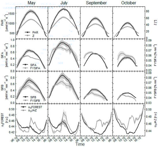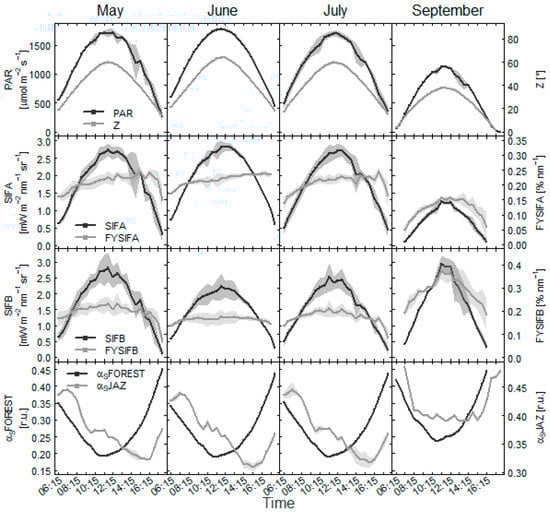 Temporal variations in the data were analyzed after selection of conditions of APAR > 300 μmol m−2 s−1 and sun elevations > 25°. These filters were applied to show seasonal dynamics in NDVI, SIFA, SIFB, and FYSIFA with FYSIFB. Then, days with clear skies, identified from the parabolic daily trend in incoming PAR, were picked up for further analysis of diurnal data trends. These data were divided into four subsets by month and averaged at half-hour intervals to show the dynamics of the means for measured variables during four characteristic periods of the year and to show variations in the variables with shadow fraction (αS). Intervals between dates in each data group do not exceed 30 days. Thus, we isolated groups of data collected under similar SZA simultaneously at 30 min steps in the day. Mean values were calculated for 3- to 5-day blocks, depending on the availability of cloudless days in the data set.