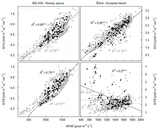 Dependency of fluorescence in O2A band (SIFA) and O2B band (SIFB) on amount of absorbed photosynthetically active radiation (APAR). Relationships between black points refer to averaged data across 2 h interval at midday on days with almost no clouds. N = 80 for spruce data set and N = 93 for beech data set. Grey points data refer to relationships on selected days between the data in 30 min intervals between 10:00 to 14:00 h. The asterisk indicates statistical significance of the result (*** for p ˂0.001, ** for p ˂0.01).