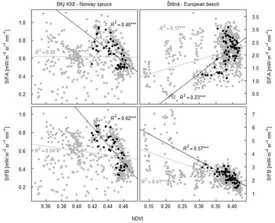 Dependency of fluorescence emission in O2A band (SIFA) and O2B band (SIFB) on NDVI of the spruce and beech forests. Black points refer to fluorescence and NDVI data in time intervals with significant relationship between fluorescence emission and NDVI. These points refer to data measured in the summer period, N = 46 for spruce data set and N = 68 for beech data set. Grey points show relationships between data in 30 min intervals, and relationships refer to time intervals shown in Figure 9. The asterisk *** indicates statistically significant result at p < 0.001.