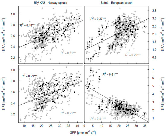 Dependency between SIFA and GPP at examined forest sites is shown in the upper panels. Dependency between SIFB and GPP is shown in the bottom panels. Black points refer to seasonal values of parameters averaged across 2 h long intervals on days with clear sky conditions. Grey points show relationship between data on selected days in 30 min temporal intervals between 10:00 and 14:00 h. The asterisk *** indicates statistically significant result at p < 0.001.