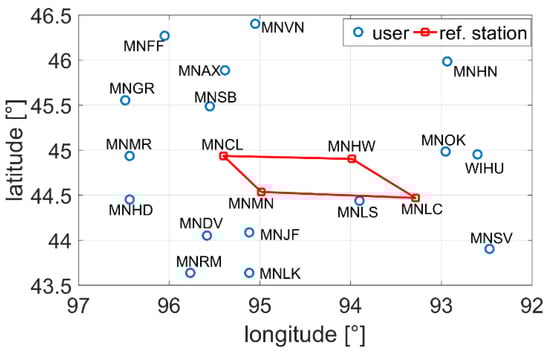 We employed observation data from a network with four reference stations and sixteen out-of-network rover stations in Minnesota, USA, as shown in Figure 2. GPS and Galileo dual-system observation data from 12:00 to 24:00 Greenwich Mean Time (6:00 to 18:00 local time) on 30 June 2020 were utilized with a 5 s sampling interval.