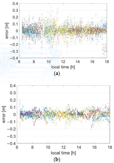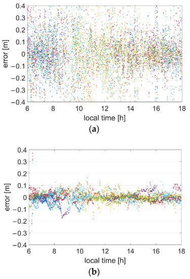 In this section, the performance of two correction utilization methods is compared using the intuitive extrapolation error distribution, the mean and the maximum of absolute values of errors, and the standard deviation of errors. The corrections generated with the user’s real observations are used as references. The differences of extrapolated and real corrections of each satellite are calculated first, which are raw errors. As raw ionosphere delay corrections have a receiver-related bias, this bias must be eliminated from the raw errors of each satellite to ensure the final errors are clean. The precise bias is not easily estimated; thus, we have utilized the mean of the raw errors as a replacement value.