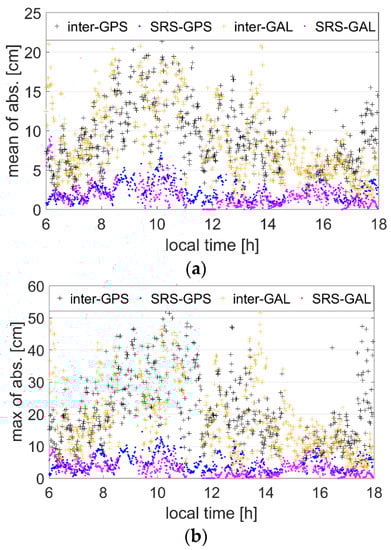 Statistical results of errors of the MNLK station; plus signs denote the results of the interpolation model, and dots represent the SRS model. (a) Mean of absolute values of errors. (b) Maximum of absolute values of errors.