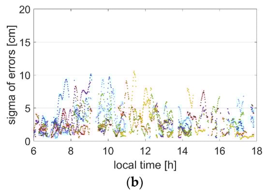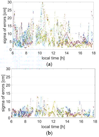 Standard deviations of L1 ionosphere delay corrections of all satellites of the MNSV station. (a) Interpolation model. (b) SRS PPP-RTK model.