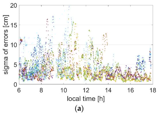 As Figure 7 shows, almost all the standard deviations are within 10 cm, and a considerable proportion of the standard deviations are less than 5 cm using the SRS PPP-RTK model. However, several results range between 10 and 20 cm for the interpolation model. The same conclusions can be obtained from Figure 8. There are few results higher than 10 cm for the SRS PPP-RTK model, unlike for the interpolation model. Moreover, the data gap in the figures is caused by the AR failure of a reference station.