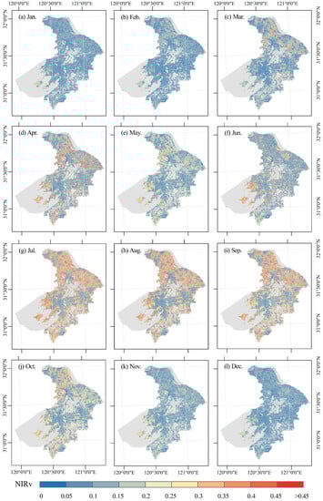 The NIRv in Suzhou’s built area ranged from 0 to 0.1, generally, without an evidently monthly dynamic. Nevertheless, there were many points scattered in the built area with high NIRvs (ranging from 0.2 to 0.35) and also seasonal changes. The urban forest in built areas contributed to the scattered high-value points. This kind of vegetation is usually found in small urban green spaces, and was represented as discrete points by remote sensing data with high resolution.