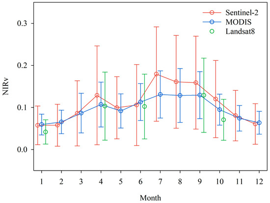For comparing the differences of NIRv derived from MODIS, Landsat-8 and Sentinel-2, the monthly averages and standard deviations of NIRv were listed in Figure 3. Sentinel-2 NIRv showed two peaks in April and July, with values of 0.13 and 0.18, respectively. The values of MODIS NIRv were generally lower than Sentinel-2 and had similar trends to Sentinel-2. Due to the impact of the cloud, the continuous change of Landsat-8 NIRv was hard to obtain. Additionally, current valid data of Landsat-8 were similar to MODIS NRIv and also showed a peak in September.