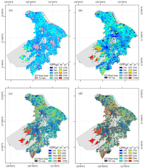 The spatial distribution of GPP from MOD17A2 product (a) and estimated by MODIS (b), Landsat-8 (c), Sentinel-2 (d). Areas in panel (a) with no data are due to the MODIS product not calculating GPP if the land cover type is built area. Additionally, the no vegetation (veg.) areas in panels (b–d) are the regions where the NDVI is less than 0.2 and, as a result, is recognized as bare land with no GPP.