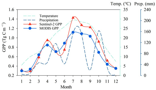 The Landsat-8 GPP failed to overcome the effects of clouds every month since its long revisit. Additionally, with the help of the MVC method, monthly NIRvs derived by MODIS and Sentinel-2 were generated. As a result, Figure 5 shows only the MODIS and Sentinel-2 GPPs, as well as the changes in monthly temperature and precipitation for the year 2021.