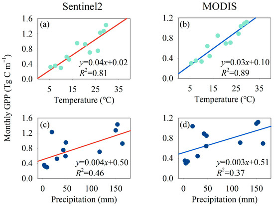 The relationship between the estimated GPP and climate factors. (a) and (b) are the correlations between temperature and monthly GPP for Sentinel2 and MODIS, respectively. (c) and (d) are the correlations between precipitation and monthly GPP for Sentinel2 and MODIS, respectively.