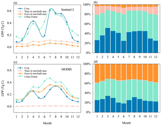 The GPP of each land cover type varied throughout the year (Figure 7a,c). Similar to the change in total GPP, each land cover type had two peaks in spring and summer. Additionally, they also showed decrements in GPP in May. These decrements in GPP for crops and urban forests were obviously about 32.33% and 23.57%, respectively, according to Sentinel-2 GPP.