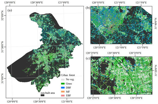 The distribution of urban forests in Suzhou (a) and its detailed views (b,c). Veg. is vegetation. DBF, MF, and EBF are deciduous broadleaf forests, mixed forests, and evergreen broadleaf forests.