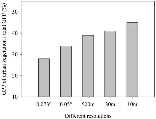 The contribution of urban forests to total GPP. The percentages of 0.073° and 0.05° are from Ju [51] and Zhang [50], respectively. Additionally, results of 500, 30, and 10 m resolutions were calculated by MODIS, Landsat-8 and Sentinel-2 in this study.