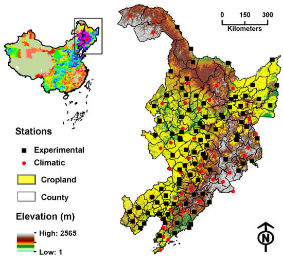 Experimental (N = 89) and climatic (N = 83) station networks in Northeast China from 2001 to 2010. The underlying digital terrain is derived from the SRTM 90 m global elevation dataset [30]. The cropland layer is extracted from ESA CCI v1.3 land cover maps [29]. Inset: Maize crop area per county in 2005, based on agricultural census data from the Ministry of Agriculture.