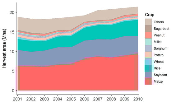 Harvest area of major crops in Northeast China from 2001 to 2010. Mha, million hectares.