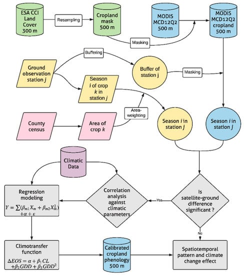 To fill the knowledge gap in calibrating satellite LSP products for cropland ecosystems, we propose a new approach to calibrating satellite-derived LSP by developing a “climotransfer” function (CTF). We demonstrate our approach in a case study of cropland LOS change in Northeast China (NEC). We use experimentally observed crop phenological data and remote sensing data derived from the Moderate Resolution Imaging Spectroradiometer (MODIS) onboard NASA’s Terra and Aqua satellites. The ground-observed crop phenology data are part of a 778-station network in China between 1991 and 2010 (http://data.cma.cn, accessed on 1 July 2020), while the MODIS Land Cover Dynamics Product [6] is available for periods later than 2001. Combining these two data sets allows us to calibrate and analyze patterns and trends in cropland LOS change at a decadal time scale in the NEC. To be more specific, the objectives of this paper are to: (1) develop a climotransfer function based on statistical characterization of the difference of LSP onsets between satellite and ground observations (hereafter satellite-ground difference) against the land-surface processes, represented by bioclimatic parameters, using data from the mono-cropping NEC [26,27] where major field crops have homogeneous crop seasons; (2) calibrate the start-of-season (SOS) and end-of-season (EOS) phenophases derived from MODIS over NEC; and (3) evaluate spatiotemporal patterns of cropland LOS change in NEC during 2001–2010, and assess the potential effects of climate change.