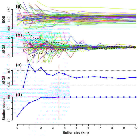 The optimal buffer size determination, taking MODIS-derived cropland SOS in 2005 as an example. (a) Station-specific SOS variations against the buffer size. Each station is represented by a distinct color; (b) SOS change (δSOS) at each buffer size increment; (c) average SOS change (SOS) per buffer size increment; and (d) the count of valid stations. The vertical dotted line represents the obtained optimal buffer size.