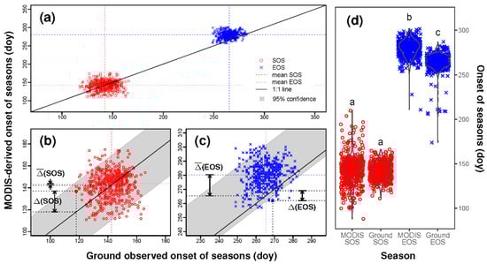 Comparison between the MODIS-derived and the ground-observed onsets of the start (SOS) and end (EOS) of the cropland growing season from 2001 to 2010 in Northeast China. (a) Scatterplot with the 1:1 line and the mean MODIS-derived versus ground-observed dates; (b,c) Enlargement showing the MODIS-ground difference in SOS and EOS at a given station (∆SOS and ∆EOS) and the mean difference (SOS and EOS); (d) Violin plots showing the data distribution of the MODIS-derived against the ground-observed SOS and EOS. Different letters above the violin plots indicate a significant difference (p < 0.001).