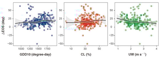 Relationships between the satellite-ground difference in the cropland growing season end (∆EOS) and the major climatic factors, including the growing degree-days at the base temperature of 10 °C (GDD10), the lower cloud cover (CL), and the wind velocity (UW). Black lines represent the best-fit trends based on local polynomial regression.
