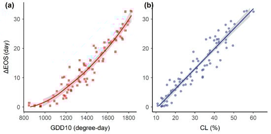 We conducted the correlation analysis to relate the satellite-ground difference in EOS (i.e., ∆EOS) to common climatic factors (Table S1 in Supplementary Materials). Among the 17 climatic factors analyzed, the lower cloud cover (CL), wind velocity (UW), and growing degree days (GDD10) were found to have strong associations with ∆EOS (Figure 6). More specifically, GDD10 and CL were found to be positively associated with ∆EOS, whereas a negative association was found for UW. The Pearson correlation coefficients were evaluated as 0.64, 0.62, and −0.46 for GDD10, CL, and UW, respectively, against ∆EOS at the highest significance levels (p < 0.0001).