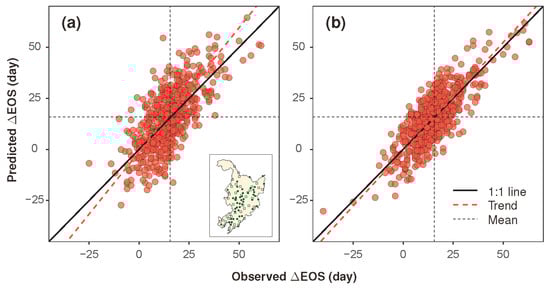 Comparison between the model-predicted versus station-characterized ∆EOS using 50–50 (a) and leave-one-out cross-validation methods (b). The inset figure in (a) shows the spatial setting of the stations used in model training (solid dots, 50%) and model validation (hollow squares, 50%). The regression equations of the trend lines are (a) and (b).