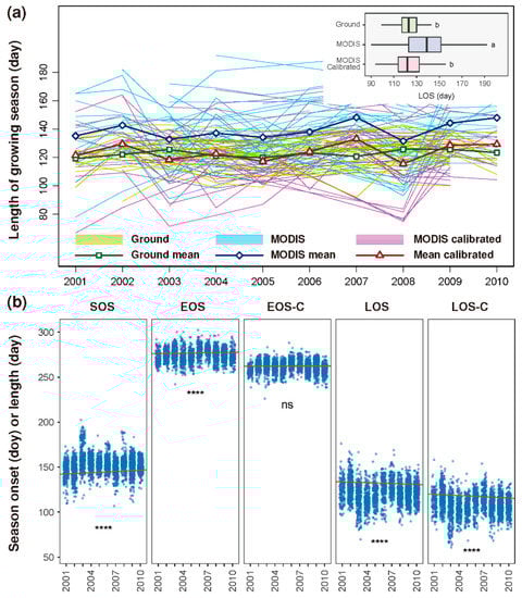 (a) Temporal variations in cropland growing season length (LOS) per station in Northeast China from 2001 to 2010. Each thin line represents a station. Each thick line with hollow markers represents the mean of all stations. Inset: Overall comparison between ground-observed and MODIS-derived versus climotransfer function-calibrated LOS. Boxplots with different lower-case letters indicate a significant difference (p < 0.001); (b) Temporal trend (solid line) in the cropland growing season based on annual time series (clustered dots) of the season start (SOS), end (EOS), and length (LOS) at the pixel scale. EOS-C and LOS-C are calibrated EOS and LOS, respectively. ****, p < 0.0001; ns, not significant.