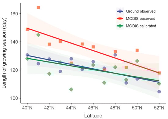 Our LOS latitudinal gradient evaluation results confirmed that the gradient supported by the calibrated MODIS data was not statistically different from the gradient obtained from the ground observation data (1.68 versus 1.19 d degree−1, p > 0.05). Therefore, confidence was attached to the estimated shortening of the cropland growing season by 1.68 days per degree of latitude northward. Without calibration, however, this gradient would be overestimated by 77%. Although this calibrated gradient was lower than the gradient of 4 d degree−1 as stipulated by the “Hopkins bioclimatic law” [52], the latter was established based on data collected from North American forests, an ecosystem different in type and location from croplands of northeastern Asia. There was no doubt that LOS calibration using the CTF model developed in this paper produced a significantly more accurate estimation of the LOS latitudinal gradient.