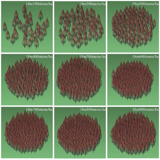 Scenarios of simulation for nine groups of simulated data. The reference height for all nine datasets is 18 m. Forest density ranges from 100 to 900 stems/ha.
