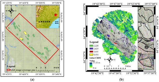 Airborne L-band PolInSAR data from the Krycklan catchment in northern Sweden, taken during ESA’s BioSAR 2008 experiment, were used for model validation in this study. The BioSAR 2008 campaign acquired high-latitude boreal forest data with terrain impacts to investigate the BIOMASS mission’s potential for estimating biomass in boreal forests. The test site (64°14′N, 19°46′E) is in Vindeln municipality, situated in Sweden (Figure 3a), with elevation changes from 100 m to 300 m and mixed coniferous forest as the dominating forest type. The dataset is available on the ESA by application and includes airborne SAR data, field inventory data such as Lidar data, DEM data, and 31 forest stands.