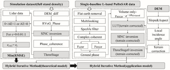 This study uses five common inversion methods in the simulated dataset to investigate the effect of forest density on the PolInSAR inversion process. According to the features of the three-phase inversion technique and SINC inversion method, a coherence magnitude and three-stage hybrid iterative inversion method are suited for various forest densities. The terrain-corrected incidence angle and vertical wavenumber were introduced into the coherence amplitude and three-phase hybrid iterative inversion model to reduce terrain’s impact on the inversion model. The model without terrain correction is called the coherence magnitude and three-stage hybrid iterative inversion theory method. The coherence magnitude and three-stage hybrid iterative inversion application model is the model with terrain correction. Figure 4 depicts the flowchart of the study.