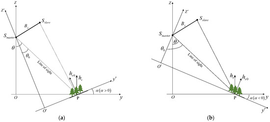 The geometric model of forest scattering is affected by terrain slope. (a) The landscape distribution faces the radar sensor when the terrain slope is positive. (b) When the terrain slope is negative, the landscape distribution is at the back of the radar sensor. and are the coordinate system under flat terrain and the slope-corrected coordinate system, respectively. means the vertical baseline. and are the master image and the slave image, respectively. P is the ground object (e.g., forest), is the radar incidence angle, is the local incidence angle, is the range slope, is the slope-corrected forest height under the coordinate system, and is the forest height under the coordinate system.