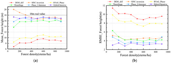 The coherence magnitude and three-stage hybrid iterative method (purple line) had significantly better inversion effects under various forest densities when compared to the other five commonly used algorithms. The model’s inversion effect was stable without apparent overestimation or underestimation. The inversion error was about 15% of the actual forest height under both sparse and dense vegetation. In a forest stand with 100 stems/ha, the inversion height was 17.3507 m, and the RMSE was 3.014 m, overcoming the drawbacks of the SINC inversion method and the three-stage inversion method, which fail at low stand densities. The forest height RMSE was 0.5–1 m lower than the phase and coherence inversion method and 1–3 m lower than the three-stage inversion method.
