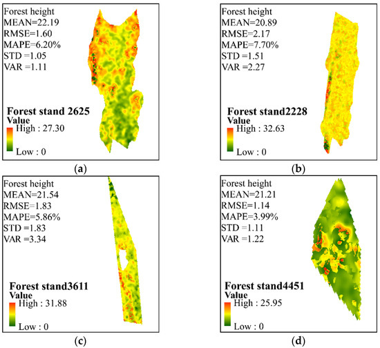 Forest height mapping in four forest stands was accomplished using coherence magnitude and three-stage hybrid iterative application algorithms. (a) Stand 2625, (b) stand 2228, (c) stand 3611, and (d) stand 4451.