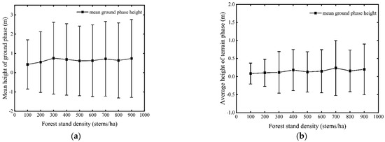 The relative height of the ground phase centers for the RVoG ground phase method was significantly lower than the DEM difference method as illustrated in Figure 9a,b. The phase separation was more significant in the RVoG ground phase method than in the DEM difference method. Figure 12 shows the ground phase error bar of the DEM difference method and RVoG ground phase method, respectively. However, when the stand density exceeds 600 stems/ha, the standard deviation of the ground phase center gradually rises. The HV and HH-VV polarization phase center heights also slowly saturated (Figure 9). As a result, the ground phase is no longer accurately represented by HH-VV.