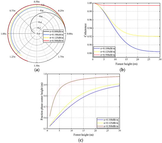 The SINC inversion method is typically a case where the extinction coefficient is 0, as shown by the black line in Figure 13a. The average extinction coefficient depends on the wavelength and the characteristics of the medium (such as height and density). When the signal frequency is fixed, the average extinction coefficient rises, indicating the existence of an effective scattering layer at the top of the bulk layer that attenuates the signal and causes a decrease in penetration depth. As a result, the average extinction coefficient and penetration depth are inversely proportional [39]. The relationship between the volume coherence and the average extinction coefficient is shown in Figure 13b. The volume coherence increases gradually for a fixed tree height as the average extinction coefficient increases. The volume layer is confined into a small space at the top of the volume, indicating a relationship between the volume coherence and the penetration depth. Volume coherence increases with increasing extinction coefficient, while penetration depth in the volume layer decreases. Figure 13c illustrates the relationship between phase, tree height, and extinction coefficient. As the extinction coefficient increases, the relative height of the phase center gradually rises, and the center of the volume scattering phase slowly moves toward the top of the canopy [8]. Extinction coefficient, volume coherence, and volume scattering phase are therefore related. As the extinction coefficient increases, the volume coherence increases, the volume scattering phase increases, while the penetration depth decreases.