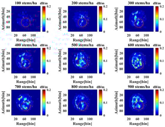 Forest density is one of the forest features. The penetration and attenuation of the signal impacted by the forest density can change the forest stand’s average extinction coefficient. Low forest density causes a wide gap in forest vegetation [40], which allows many electromagnetic wave signals to pass through and reach the ground. It reduces signal attenuation in the volume layer, increases penetration depth, and reduces the extinction coefficient. Figure 14 shows two-dimensional images of nine sets of forest stands’ extinction coefficients, with the red circles at the same location on each set of images. For forest stands with densities of 100 stems/ha and 200 stems/ha, the extinction coefficient of the volume layer is lower as shown in Figure 14. The attenuation of the signal into the stand rises as the stand density grows, the extinction coefficient increases, and the effective volume layer develops at the top of the canopy, impacting the computation of complex coherence. When the density grows from 100 stems/ha to 600 stems/ha, the average extinction coefficient in the red circle increases progressively (Figure 14). However, when the stand density reaches 700–900 stems/ha, the extinction coefficient begins to fluctuate, causing fluctuations in the mean phase and amplitude at higher stand densities.