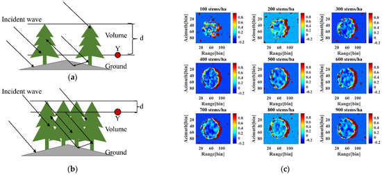 Diagram showing the relative tree height error, penetration depth, and forest density. (a) Schematic representation of signal penetration at low forest density, where penetration depth d is higher, and canopy phase center Y is lower. (b) Schematic illustration of signal penetration at high forest density showing that the penetration depth d is less and the canopy phase center Y is more elevated and closer to the canopy’s top. (c) The relative error (penetration depth) of the nine groups of forest stand inversions using the traditional three-stage inversion method.