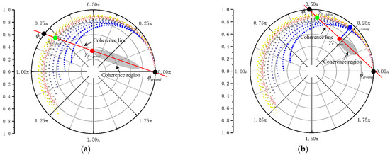 According to the traditional three-stage inversion method, the ideal coherence region comprises all the complex coherence points (the gray elliptical area in Figure 16). The extinction coefficient is often empirically adjusted as a constant to increase the effectiveness of the whole image inversion, which reduces the number of spirals in the LUT to one (the red circle spiral in Figure 16). The hypothetical pure-volume scattering complex coherence point , indicated by the red dot in Figure 16a, is located on the ellipse’s long axis furthest from the ground phase . In an ideal situation, finding the closest point (green dot in Figure 16) to in the LUT should yield suitable tree height and extinction coefficient values. The distance between and becomes too large when the coherence region is too distant from the LUT or if the coherence region’s long axis is not long enough. It means (the blue dots in Figure 16b) is closer to than , which causes a significant under- or overestimation of forest height.